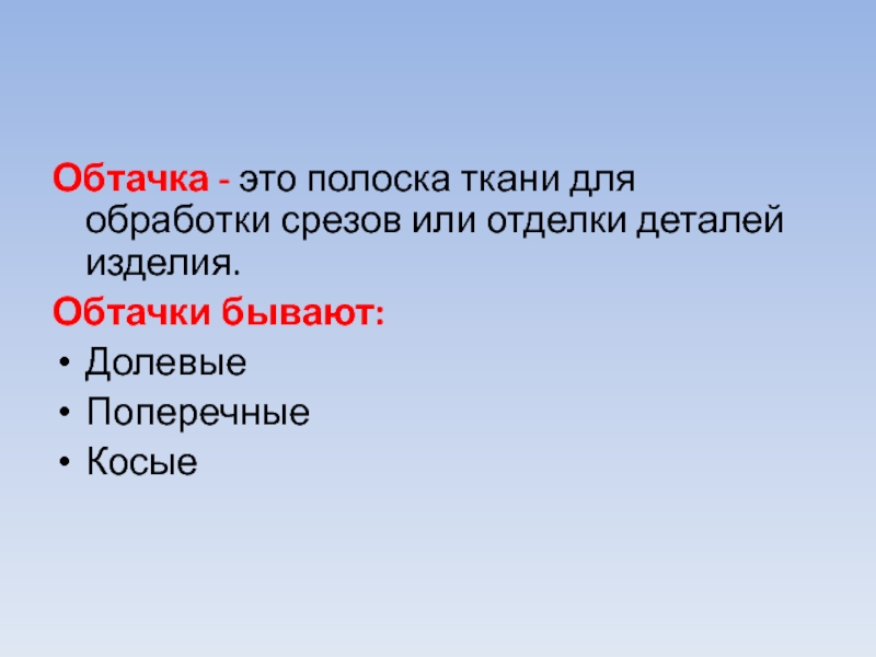 Обтачка - это полоска ткани для обработки срезов или отделки деталей изделия.Обтачки бывают:ДолевыеПоперечныеКосые