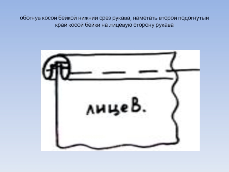 Слайд 10обогнув косой бейкой нижний срез рукава, наметать второй подогнутый край