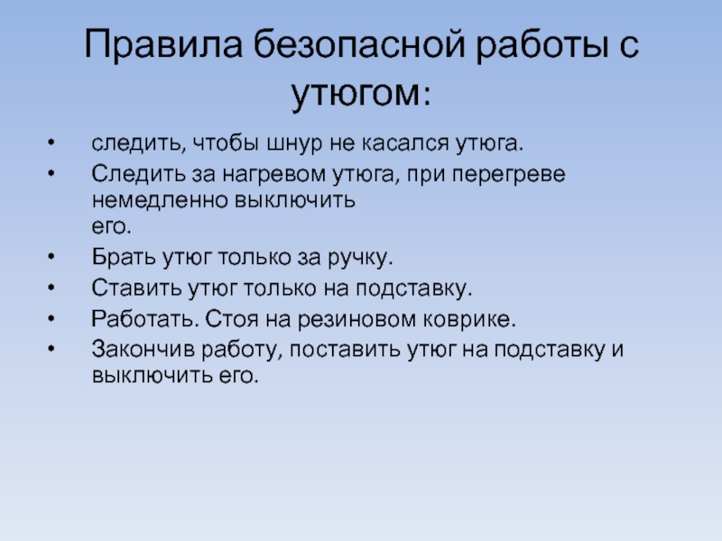 Правила безопасной работы с утюгом:следить, чтобы шнур не касался утюга.Следить за нагревом утюга, при перегреве немедленно выключить