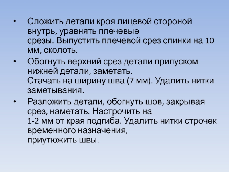 Слайд 7Сложить детали кроя лицевой стороной внутрь, уравнять плечевые срезы. Выпустить плечевой