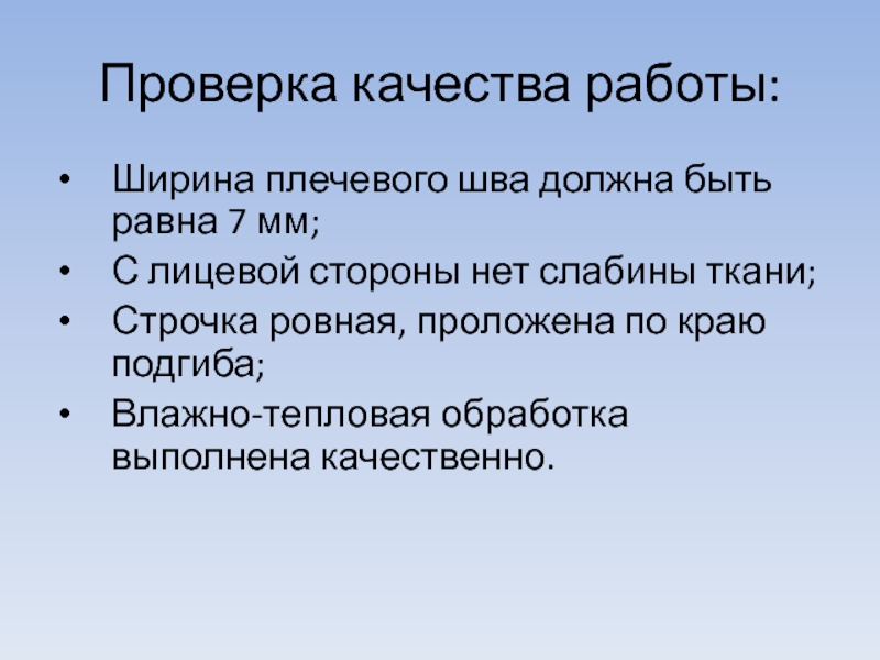 Проверка качества работы: Ширина плечевого шва должна быть равна 7 мм;С лицевой стороны нет слабины ткани;Строчка ровная,