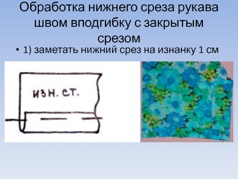 Слайд 12Обработка нижнего среза рукава швом вподгибку с закрытым срезом