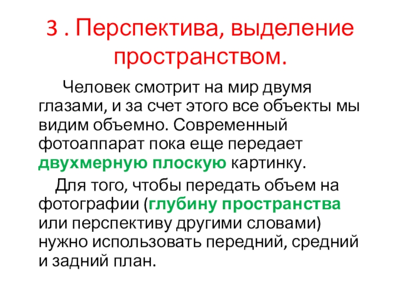 объекты мы видим объемно. Современный фотоаппарат пока еще передает двухмерную плоскую картинку.