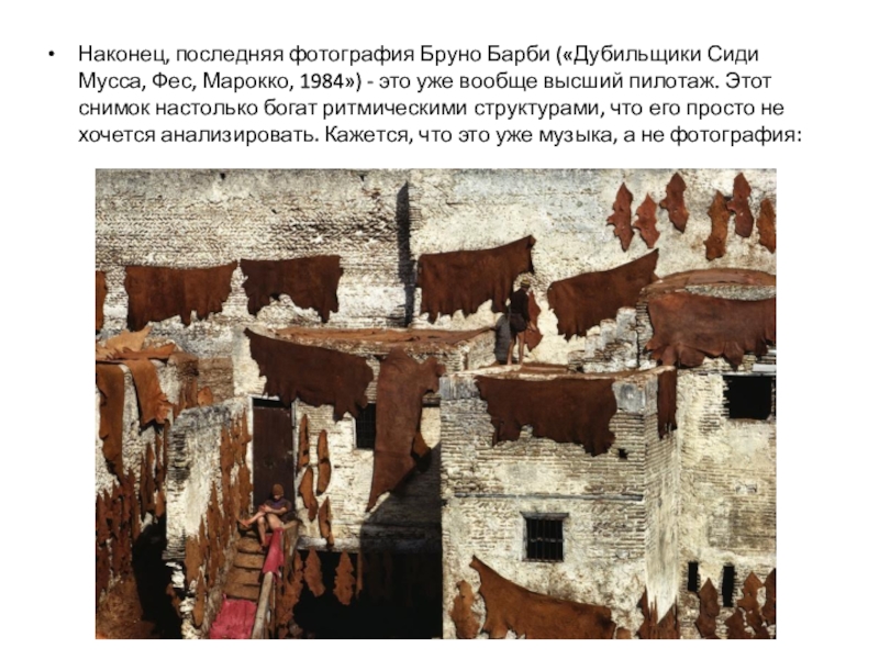 Слайд 42Наконец, последняя фотография Бруно Барби («Дубильщики Сиди Мусса, Фес, Марокко,