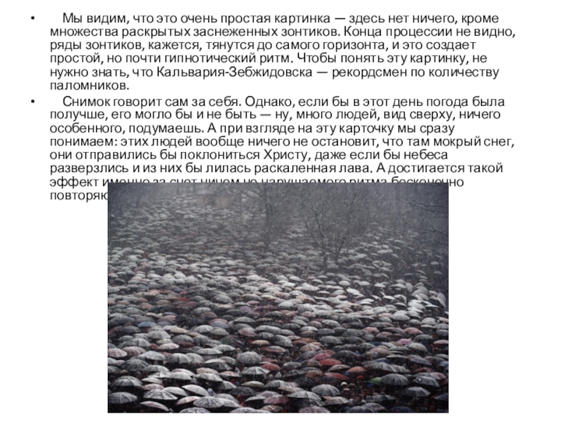 Снимок говорит сам за себя. Однако, если бы в этот день погода была получше, его могло бы и не быть — ну, много людей, вид сверху, ничего особенного, подумаешь. А при взгляде на эту карточку мы сразу понимаем: этих людей вообще ничего не остановит, что там мокрый снег, они отправились бы поклониться Христу, даже если бы небеса разверзлись и из них бы лилась раскаленная лава. А достигается такой эффект именно за счет ничем не нарушаемого ритма бесконечно повторяющихся зонтов.