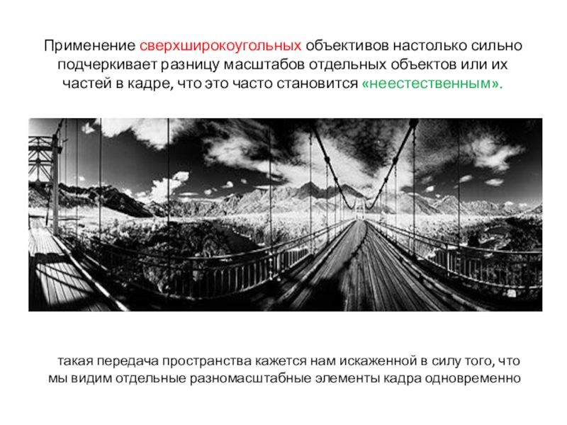Слайд 16Применение сверхширокоугольных объективов настолько сильно подчеркивает разницу масштабов отдельных объектов