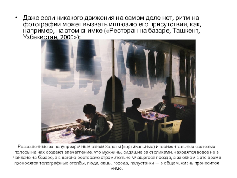 Даже если никакого движения на самом деле нет, ритм на фотографии может вызвать иллюзию его присутствия, как, например, на этом снимке («Ресторан на базаре, Ташкент, Узбекистан, 2000»):