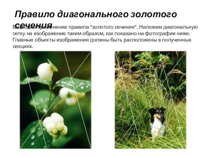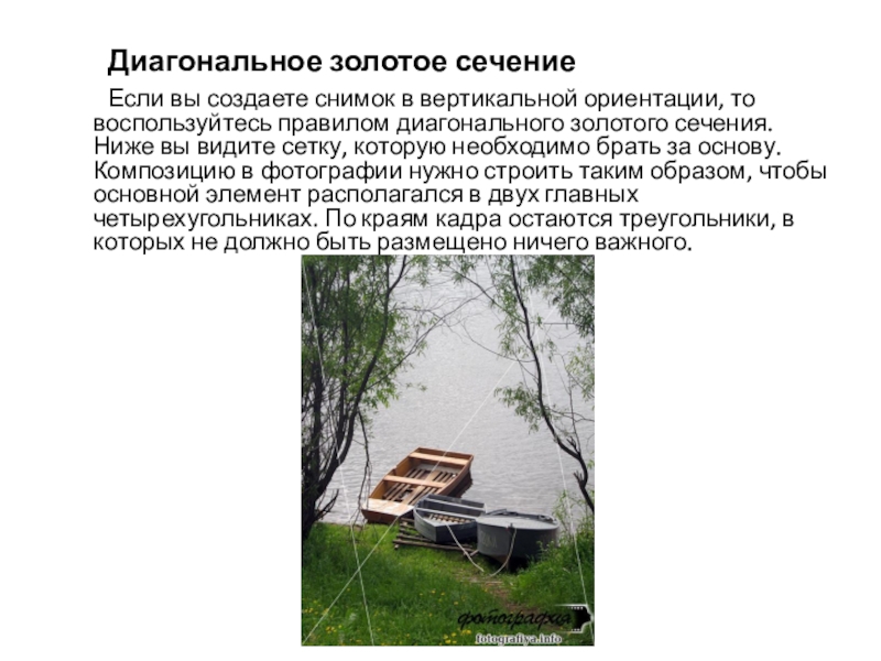 диагонального золотого сечения. Ниже вы видите сетку, которую необходимо брать за основу. Композицию в фотографии нужно строить таким образом, чтобы основной элемент располагался в двух главных четырехугольниках. По краям кадра остаются треугольники, в которых не должно быть размещено ничего важного.