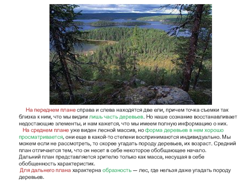 На среднем плане уже виден лесной массив, но форма деревьев в нем хорошо просматривается, они еще в какой-то степени воспринимаются индивидуально. Мы можем если не рассмотреть, то скорее угадать породу деревьев, их возраст. Средний план отличается тем, что он несет в себе некоторое обобщающее начало.