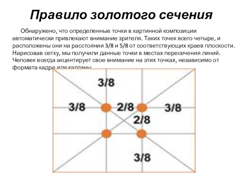 и расположены они на расстоянии 3/8 и 5/8 от соответствующих краев плоскости. Нарисовав сетку, мы получили данные точки в местах пересечения линий. Человек всегда акцентирует свое внимание на этих точках, независимо от формата кадра или картины.