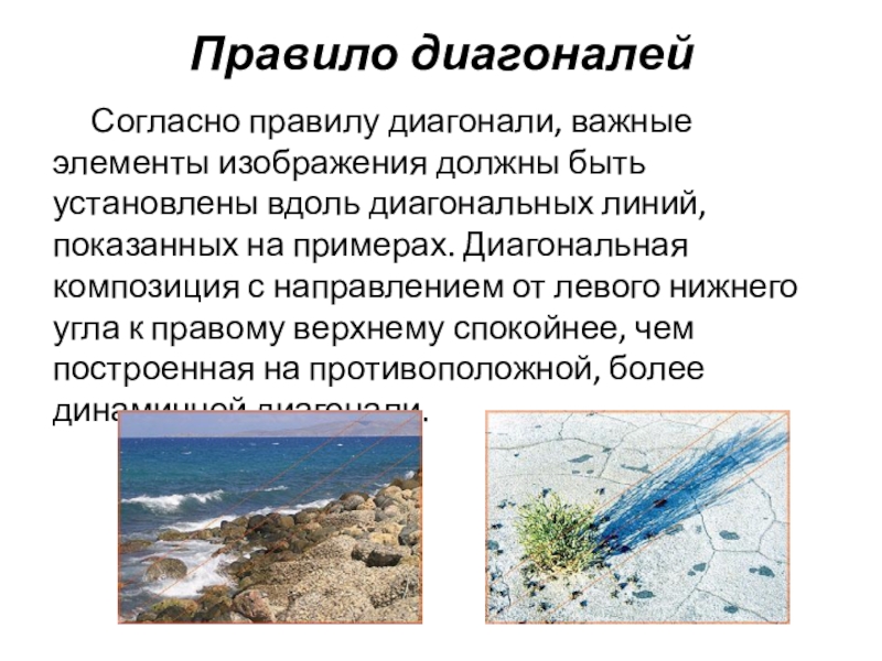 композиция с направлением от левого нижнего угла к правому верхнему спокойнее, чем построенная на противоположной, более динамичной диагонали.