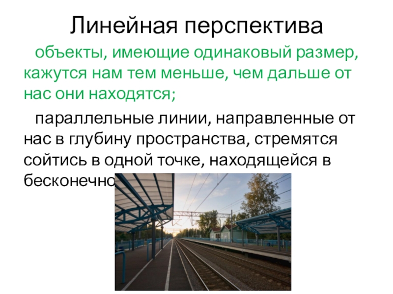 окружающие предметы кажутся нам тем меньше, чем дальше от нас они находятся. Такое изменение размеров предметов в зависимости от их удаленности вызывает впечатление линейной перспективы.