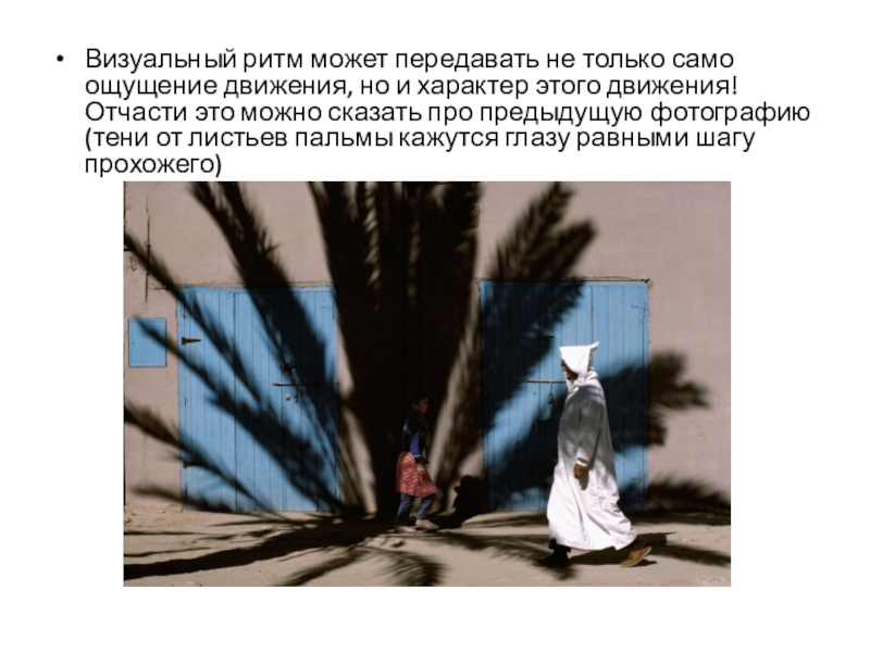 фотографию (тени от листьев пальмы кажутся глазу равными шагу прохожего)