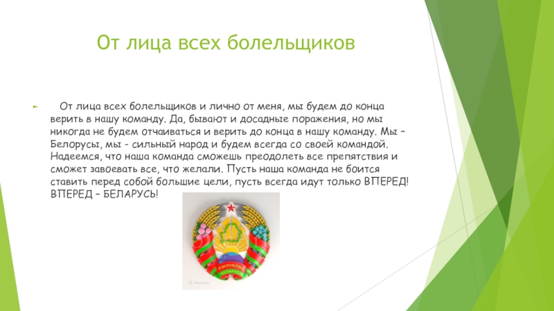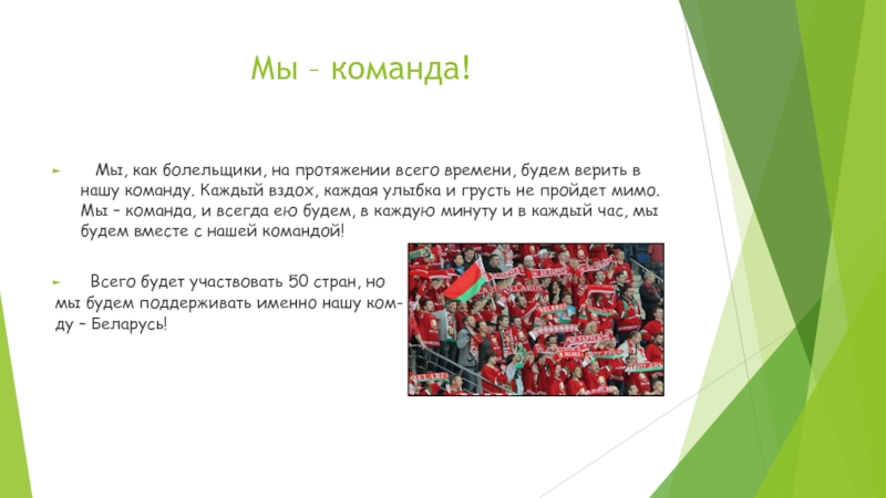 участник, но и как “Хозяйка” всего торжества.В честь этого, мы, как болельщики, решили поддержать нашу страну и команду! Мы будем всегда верить в нашу команду, в наших героев, от которых ждём только побед!