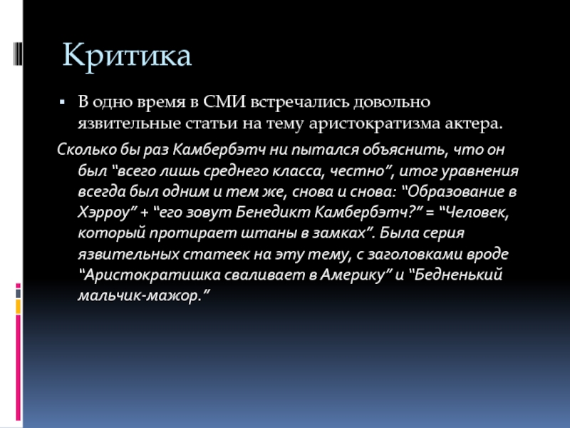 что он был “всего лишь среднего класса, честно”, итог уравнения всегда был одним и тем же, снова и снова: “Образование в Хэрроу” + “его зовут Бенедикт Камбербэтч?” = “Человек, который протирает штаны в замках”. Была серия язвительных статеек на эту тему, с заголовками вроде “Аристократишка сваливает в Америку” и “Бедненький мальчик-мажор.”