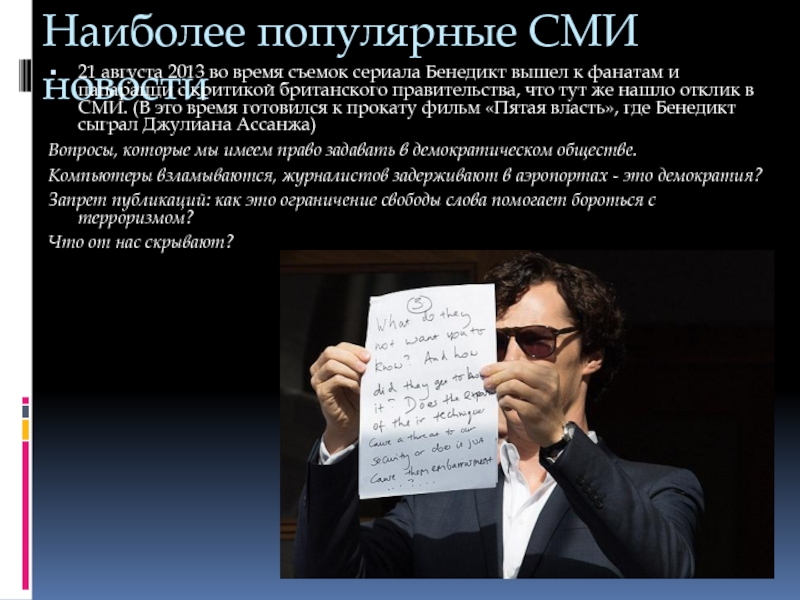 что тут же нашло отклик в СМИ. (В это время готовился к прокату фильм «Пятая власть», где Бенедикт сыграл Джулиана Ассанжа)