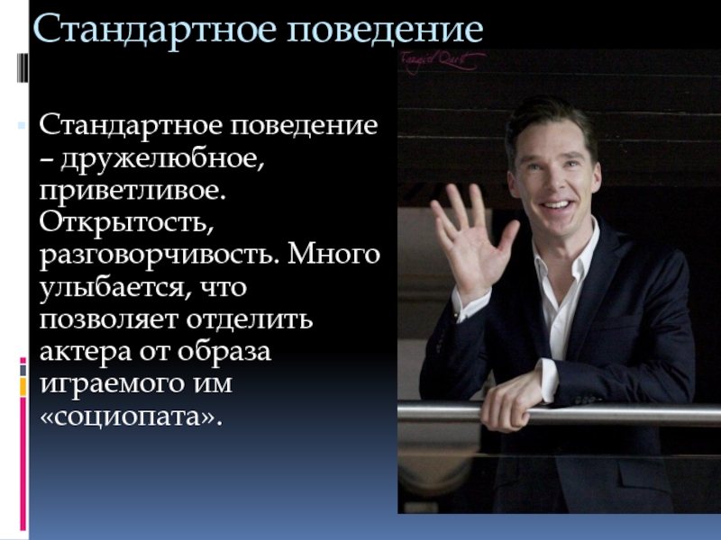 Стандартное поведение – дружелюбное, приветливое. Открытость, разговорчивость. Много улыбается,