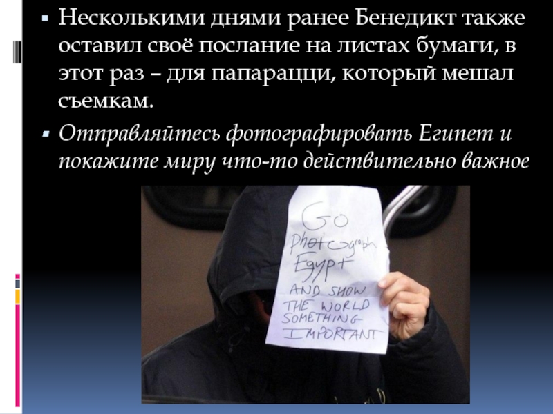Слайд 5Несколькими днями ранее Бенедикт также оставил своё послание на листах