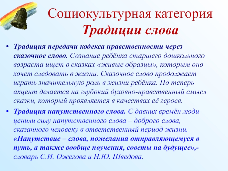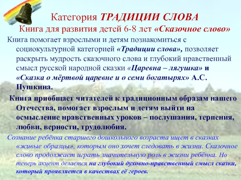 которым оно хочет следовать в жизни. Сказочное слово продолжает играть значительную роль в жизни ребёнка. Но теперь акцент делается на глубокий духовно-нравственный смысл сказки, который проявляется в качествах её героев.