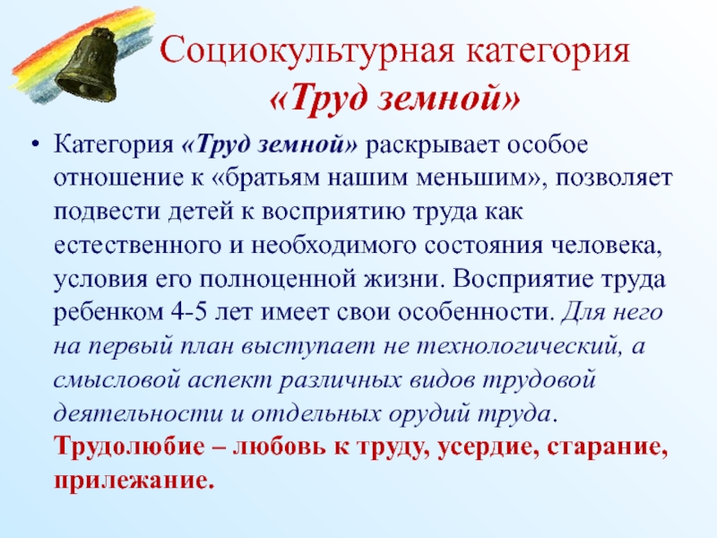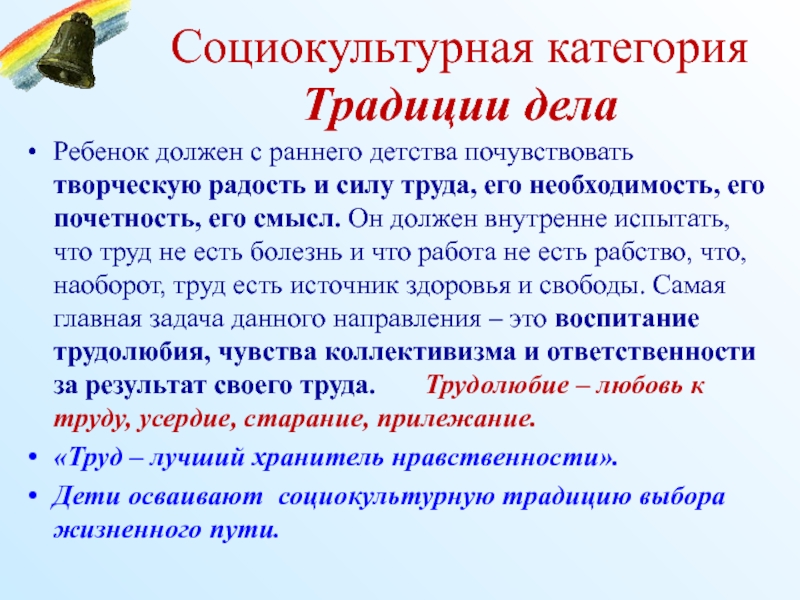 Он должен внутренне испытать, что труд не есть болезнь и что работа не есть рабство, что, наоборот, труд есть источник здоровья и свободы. Самая главная задача данного направления – это воспитание трудолюбия, чувства коллективизма и ответственности за результат своего труда. Трудолюбие – любовь к труду, усердие, старание, прилежание.