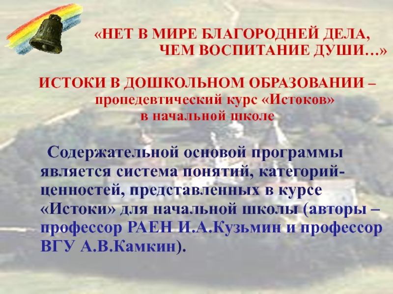 Содержательной основой программы является система понятий, категорий-ценностей, представленных в курсе «Истоки» для начальной школы (авторы – профессор РАЕН И.А.Кузьмин и профессор ВГУ А.В.Камкин).