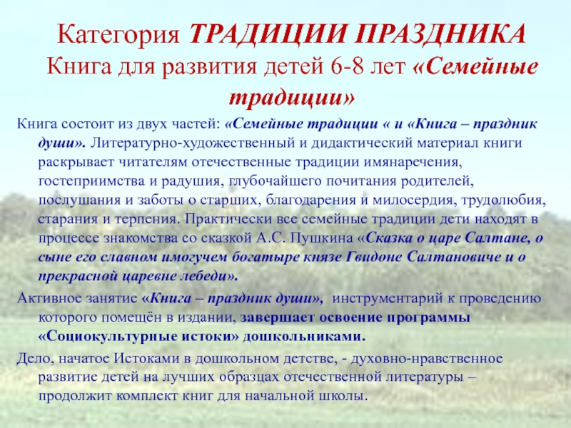 – праздник души». Литературно-художественный и дидактический материал книги раскрывает читателям отечественные традиции имянаречения, гостеприимства и радушия, глубочайшего почитания родителей, послушания и заботы о старших, благодарения и милосердия, трудолюбия, старания и терпения. Практически все семейные традиции дети находят в процессе знакомства со сказкой А.С. Пушкина «Сказка о царе Салтане, о сыне его славном имогучем богатыре князе Гвидоне Салтановиче и о прекрасной царевне лебеди».