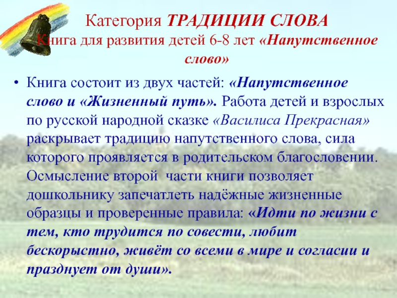 Работа детей и взрослых по русской народной сказке «Василиса Прекрасная» раскрывает традицию напутственного слова, сила которого проявляется в родительском благословении. Осмысление второй части книги позволяет дошкольнику запечатлеть надёжные жизненные образцы и проверенные правила: «Идти по жизни с тем, кто трудится по совести, любит бескорыстно, живёт со всеми в мире и согласии и празднует от души».