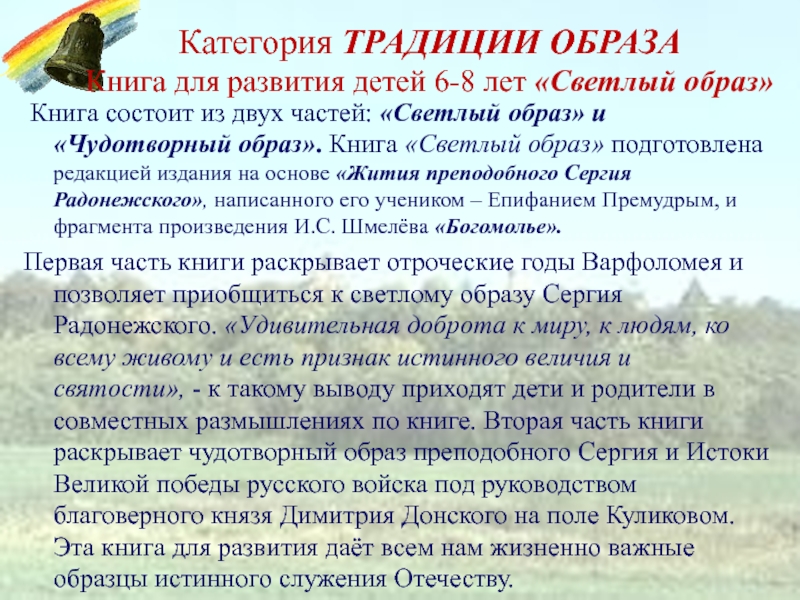образ». Книга «Светлый образ» подготовлена редакцией издания на основе «Жития преподобного Сергия Радонежского», написанного его учеником – Епифанием Премудрым, и фрагмента произведения И.С. Шмелёва «Богомолье».