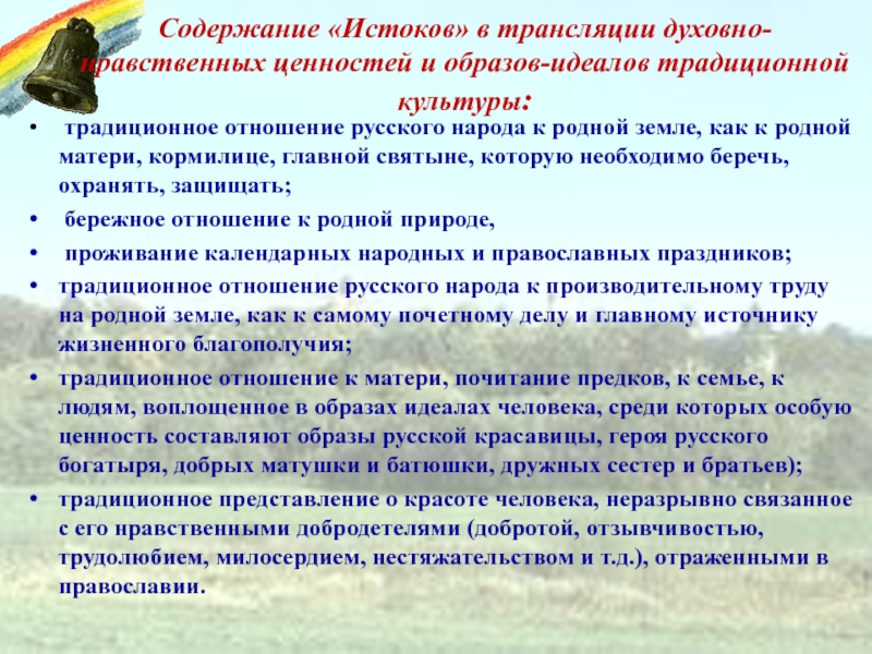 Содержание «Истоков» в трансляции духовно-нравственных ценностей и образов-идеалов традиционной культуры: