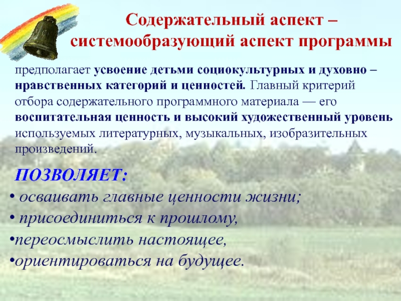 Слайд 7Содержательный аспект – системообразующий аспект программы