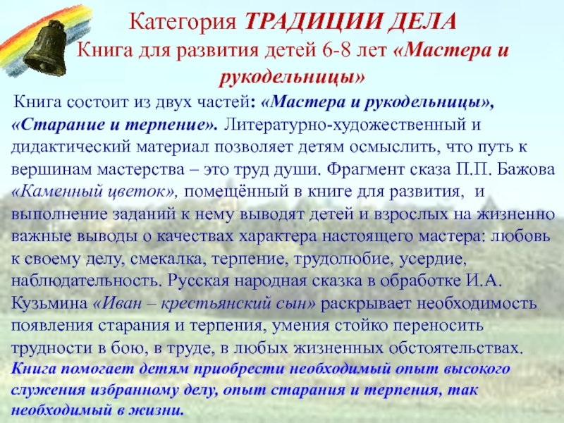 и рукодельницы», «Старание и терпение». Литературно-художественный и дидактический материал позволяет детям осмыслить, что путь к вершинам мастерства – это труд души. Фрагмент сказа П.П. Бажова «Каменный цветок», помещённый в книге для развития, и выполнение заданий к нему выводят детей и взрослых на жизненно важные выводы о качествах характера настоящего мастера: любовь к своему делу, смекалка, терпение, трудолюбие, усердие, наблюдательность. Русская народная сказка в обработке И.А. Кузьмина «Иван – крестьянский сын» раскрывает необходимость появления старания и терпения, умения стойко переносить трудности в бою, в труде, в любых жизненных обстоятельствах. Книга помогает детям приобрести необходимый опыт высокого служения избранному делу, опыт старания и терпения, так необходимый в жизни.