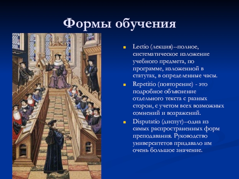 Disputatio (диспут)--одна из самых распространенных форм преподавания. Руководство университетов придавало им очень большое значение.