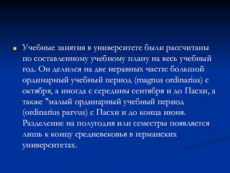 большой ординарный учебный период (magnus оrdinarius) с октября, а иногда с середины сентября и до Пасхи, а также "малый ординарный учебный период (ordinarius parvus) с Пасхи и до конца июня. Разделение на полугодия или семестры появляется лишь к концу средневековья в германских университетах.