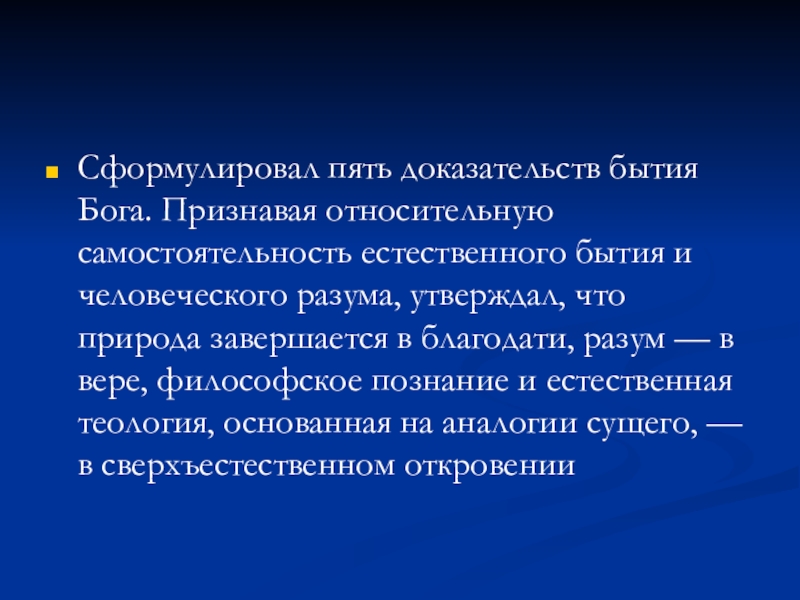 Слайд 16Сформулировал пять доказательств бытия Бога. Признавая относительную самостоятельность естественного бытия