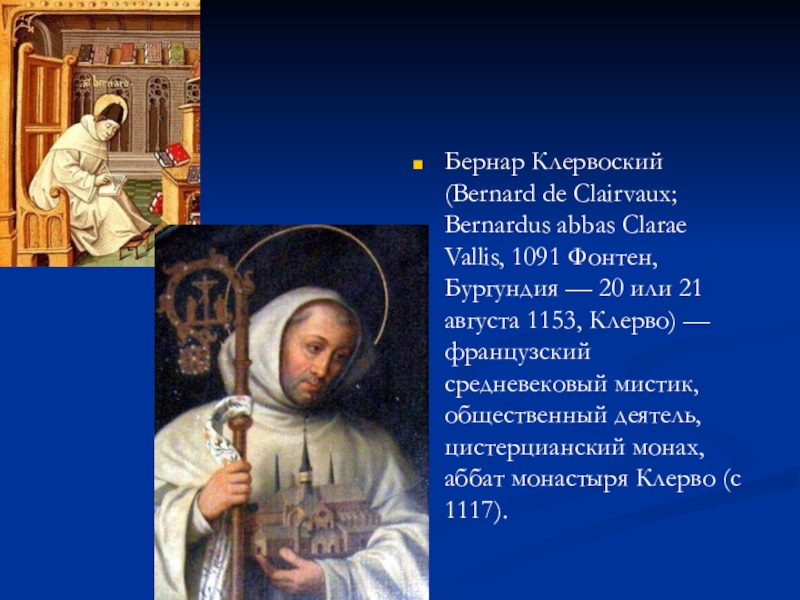 Слайд 12Бернар Клервоский (Bernard de Clairvaux; Bernardus abbas Clarae Vallis, 1091