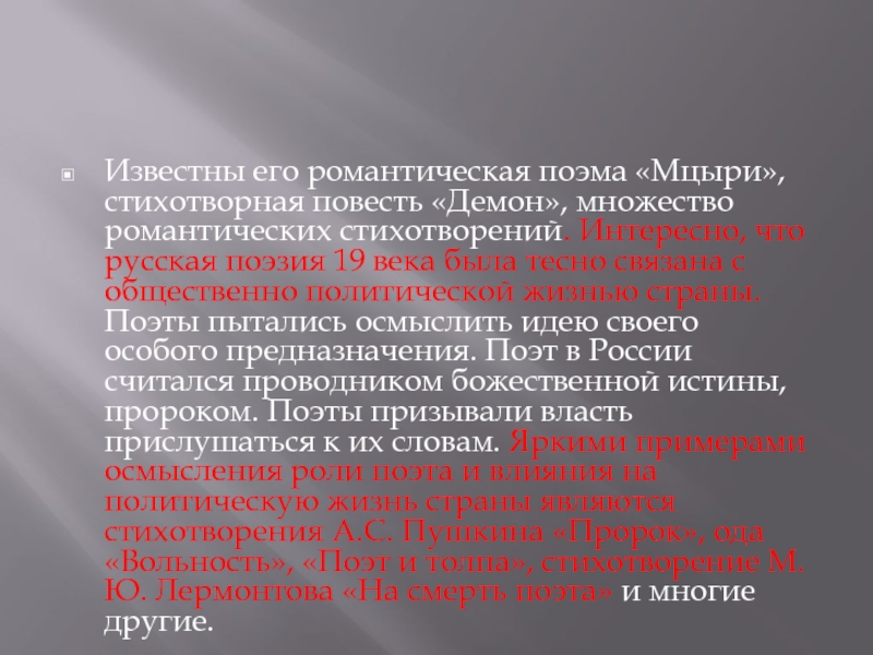с общественно политической жизнью страны. Поэты пытались осмыслить идею своего особого предназначения. Поэт в России считался проводником божественной истины, пророком. Поэты призывали власть прислушаться к их словам. Яркими примерами осмысления роли поэта и влияния на политическую жизнь страны являются стихотворения А.С. Пушкина «Пророк», ода «Вольность», «Поэт и толпа», стихотворение М.Ю. Лермонтова «На смерть поэта» и многие другие.