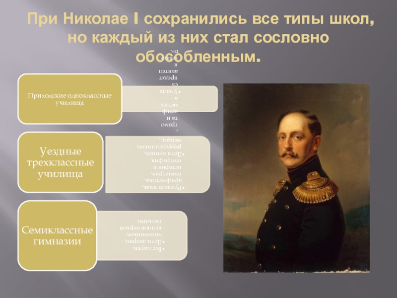 Слайд 3При Николае I сохранились все типы школ, но каждый из