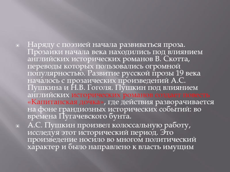 огромной популярностью. Развитие русской прозы 19 века началось с прозаических произведений А.С. Пушкина и Н.В. Гоголя. Пушкин под влиянием английских исторических романов создает повесть «Капитанская дочка», где действия разворачивается на фоне грандиозных исторических событий: во времена Пугачевского бунта.