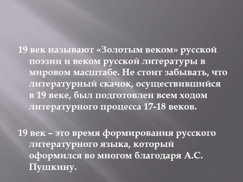 19 век – это время формирования русского литературного языка, который оформился во многом благодаря А.С. Пушкину.