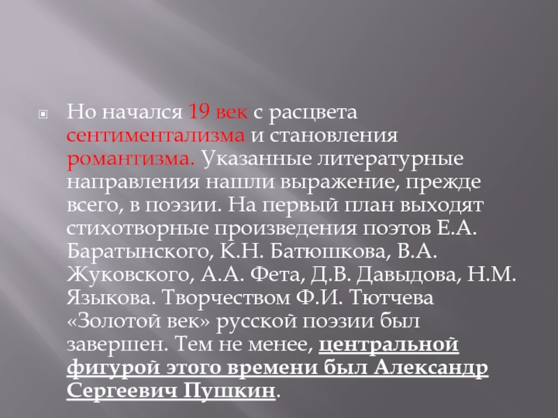первый план выходят стихотворные произведения поэтов Е.А. Баратынского, К.Н. Батюшкова, В.А. Жуковского, А.А. Фета, Д.В. Давыдова, Н.М. Языкова. Творчеством Ф.И. Тютчева «Золотой век» русской поэзии был завершен. Тем не менее, центральной фигурой этого времени был Александр Сергеевич Пушкин.