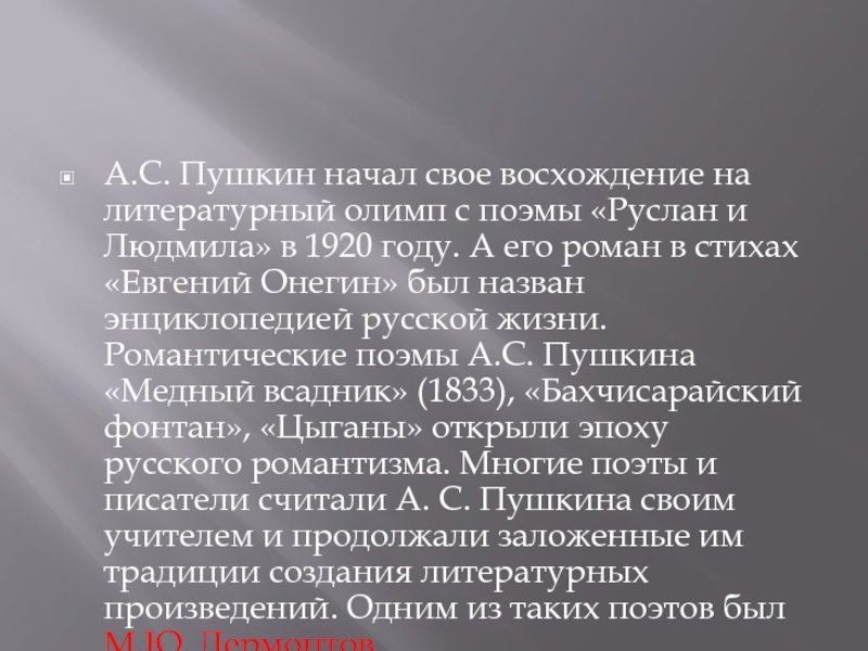 стихах «Евгений Онегин» был назван энциклопедией русской жизни. Романтические поэмы А.С. Пушкина «Медный всадник» (1833), «Бахчисарайский фонтан», «Цыганы» открыли эпоху русского романтизма. Многие поэты и писатели считали А. С. Пушкина своим учителем и продолжали заложенные им традиции создания литературных произведений. Одним из таких поэтов был М.Ю. Лермонтов.