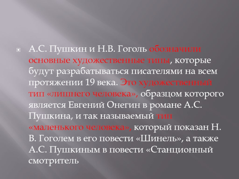 тип «лишнего человека», образцом которого является Евгений Онегин в романе А.С. Пушкина, и так называемый тип «маленького человека», который показан Н.В. Гоголем в его повести «Шинель», а также А.С. Пушкиным в повести «Станционный смотритель