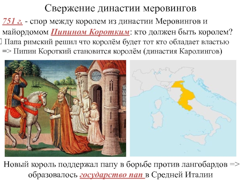 Новый король поддержал папу в борьбе против лангобардов => образовалось государство пап в Средней Италии