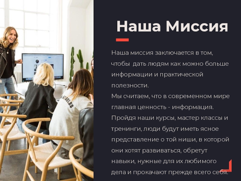 мире главная ценность - информация. Пройдя наши курсы, мастер классы и тренинги, люди будут иметь ясное представление о той ниши, в которой они хотят развиваться, обретут навыки, нужные для их любимого дела и прокачают прежде всего себя.