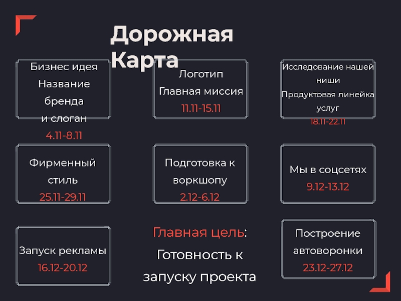Дорожная КартаБизнес идеяНазвание бренда и слоган4.11-8.11Построение автоворонки23.12-27.12Запуск рекламы16.12-20.12Мы в соцсетях9.12-13.12Подготовка к воркшопу2.12-6.12Фирменный стиль25.11-29.11Исследование нашей нишиПродуктовая линейка услуг18.11-22.11ЛоготипГлавная