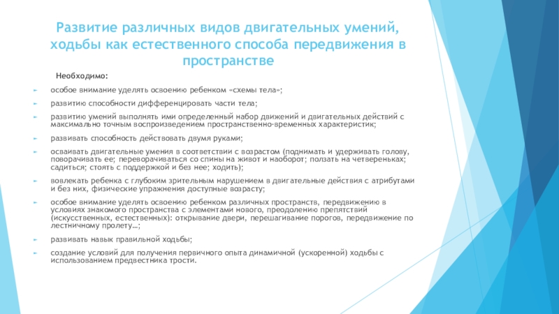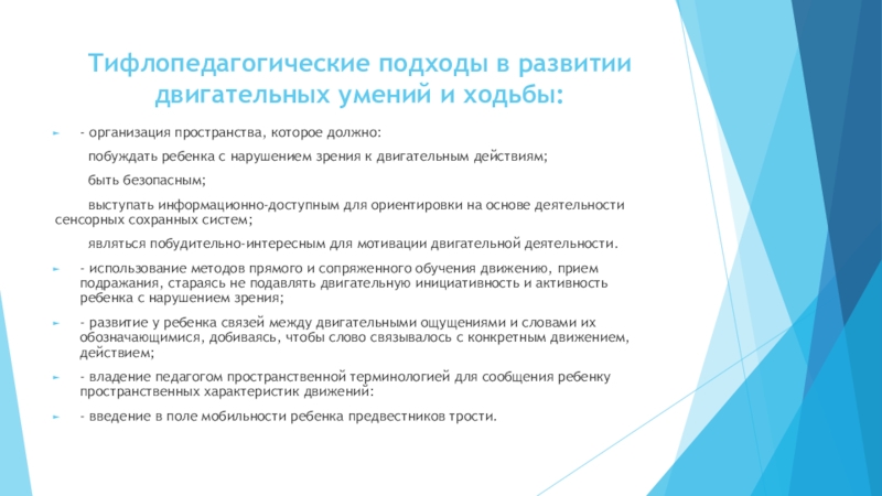 Слайд 9Тифлопедагогические подходы в развитии двигательных умений и ходьбы: