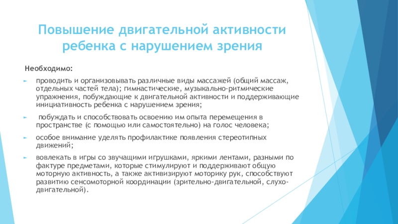 - Повышение двигательной активности ребенка с нарушением зрения;