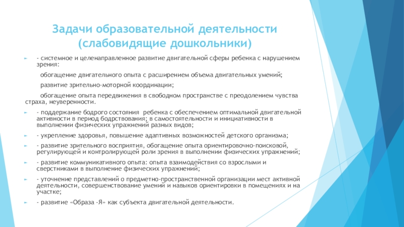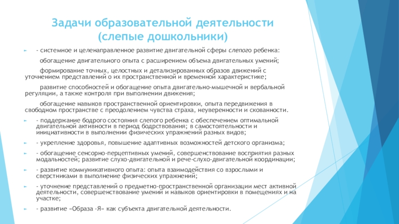 - поддержание бодрого состояния слепого ребенка с обеспечением оптимальной двигательной активности в период бодрствования; в самостоятельности и инициативности в выполнении физических упражнений разных видов;