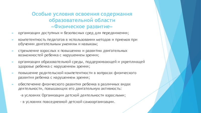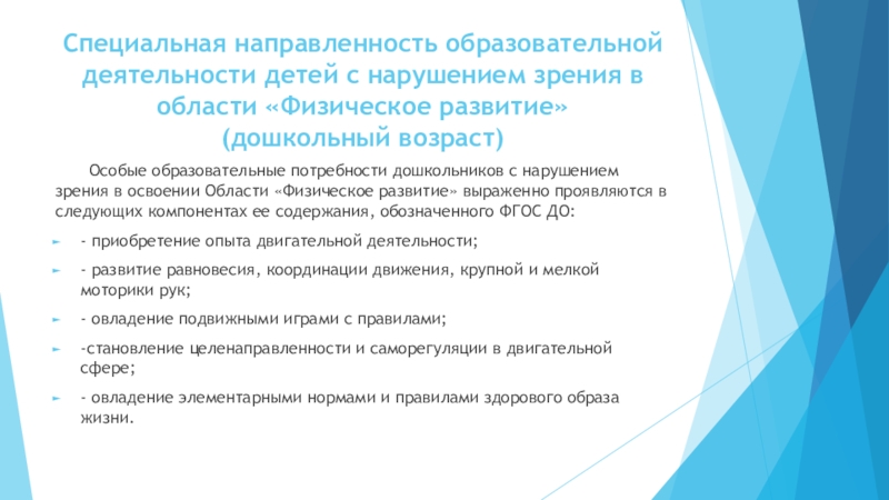 Слайд 12Специальная направленность образовательной деятельности детей с нарушением зрения в области