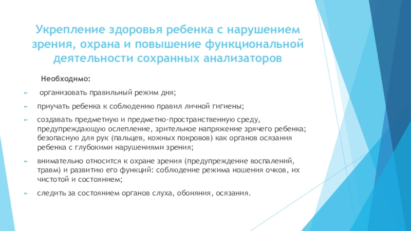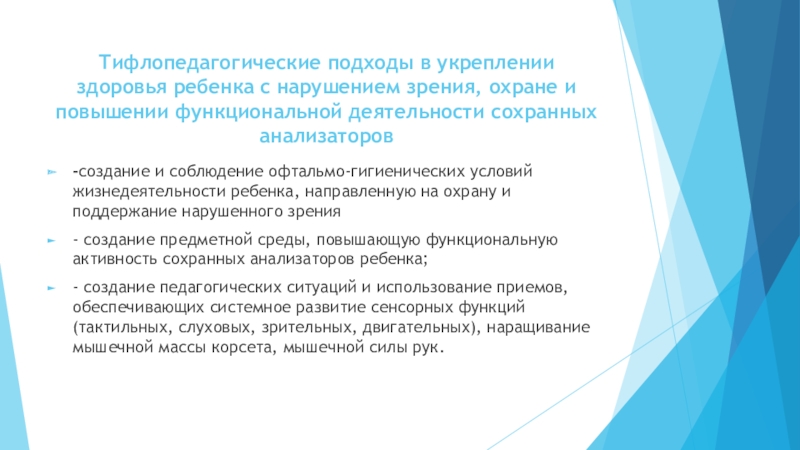 Слайд 7Тифлопедагогические подходы в укреплении здоровья ребенка с нарушением зрения, охране